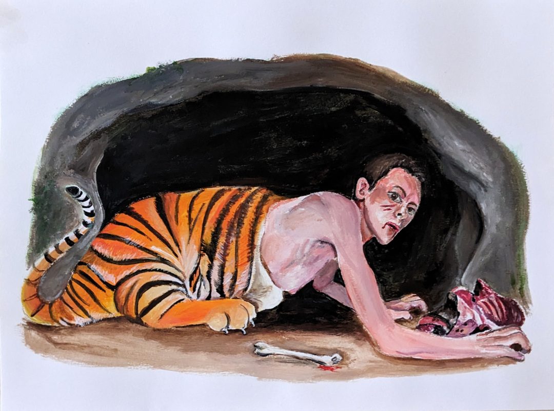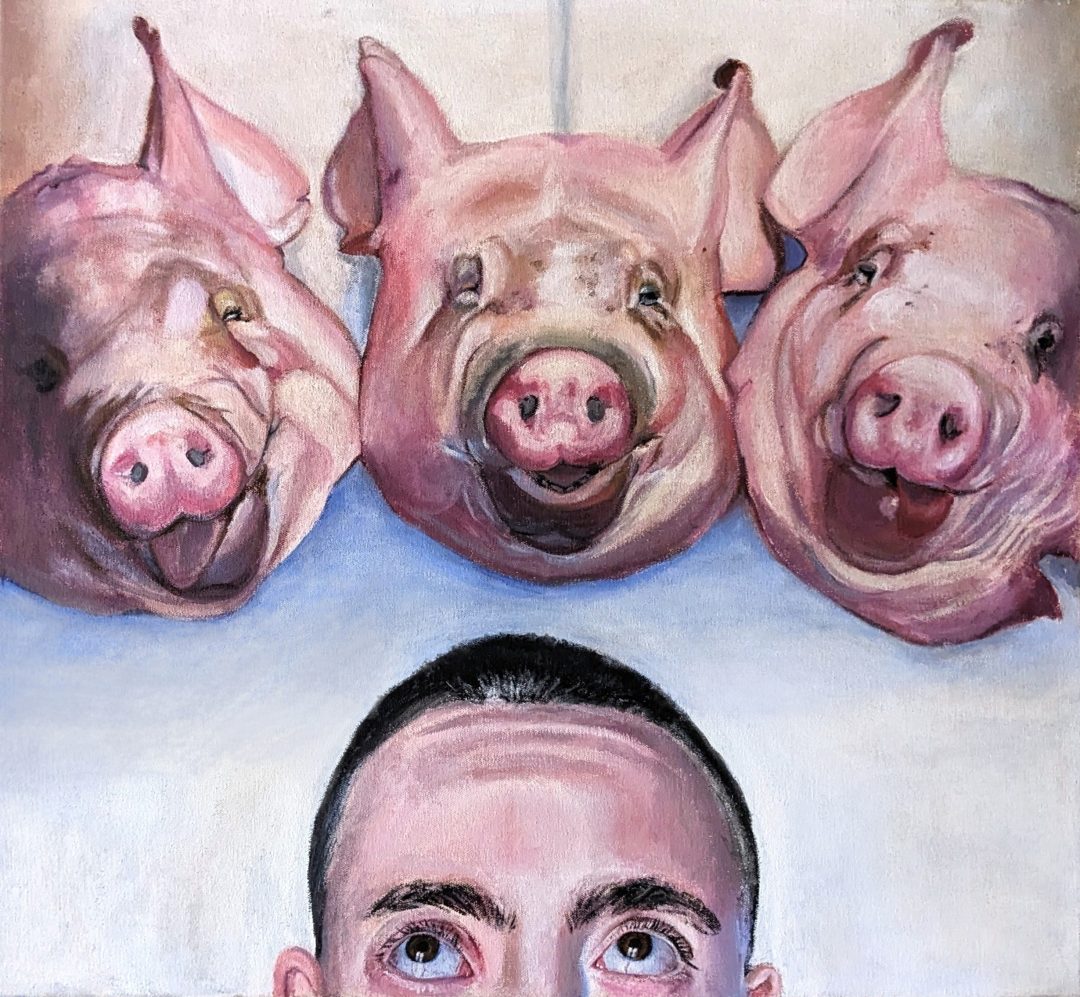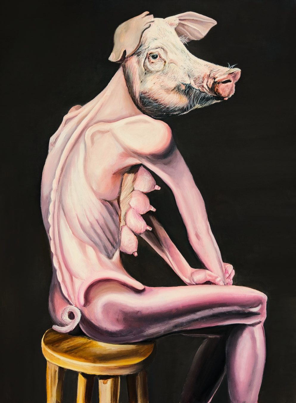 Man-eater, acrylic on paper, 9×12,” 2025Piglet, oil on canvas, 16×20″, 2023Why She Laughs, acrylic on paper, 12×9,” 2024Pride, acrylic on paper, 12×9,” 2024Metamorphosis, acrylic on paper, 12×9,” 2024Bearded Lady, acrylic on paper, 12×9,” 2024Paternity, acrylic on paper, 12×9,” 2024She-Cock, acrylic on paper, 12×9,” 2024