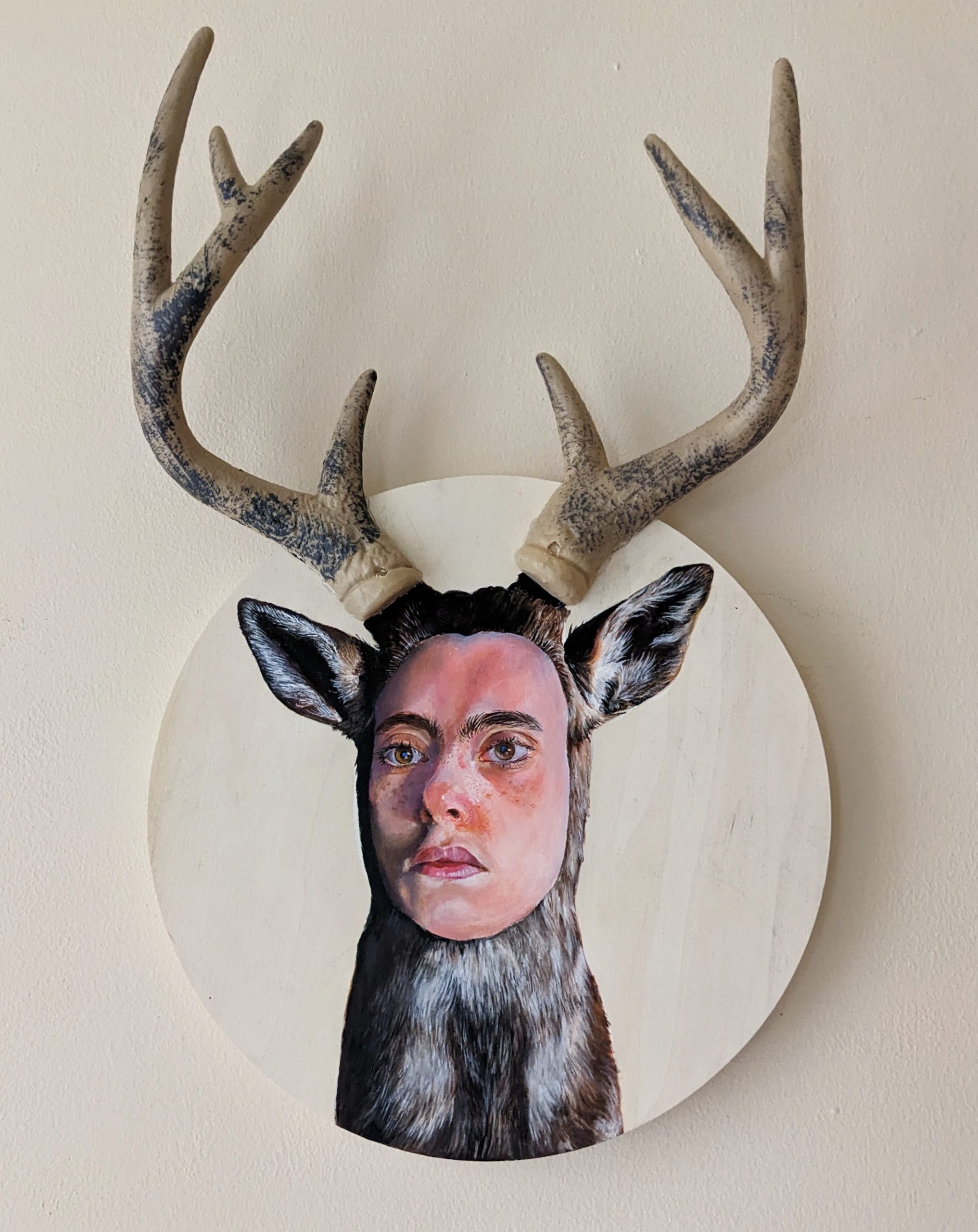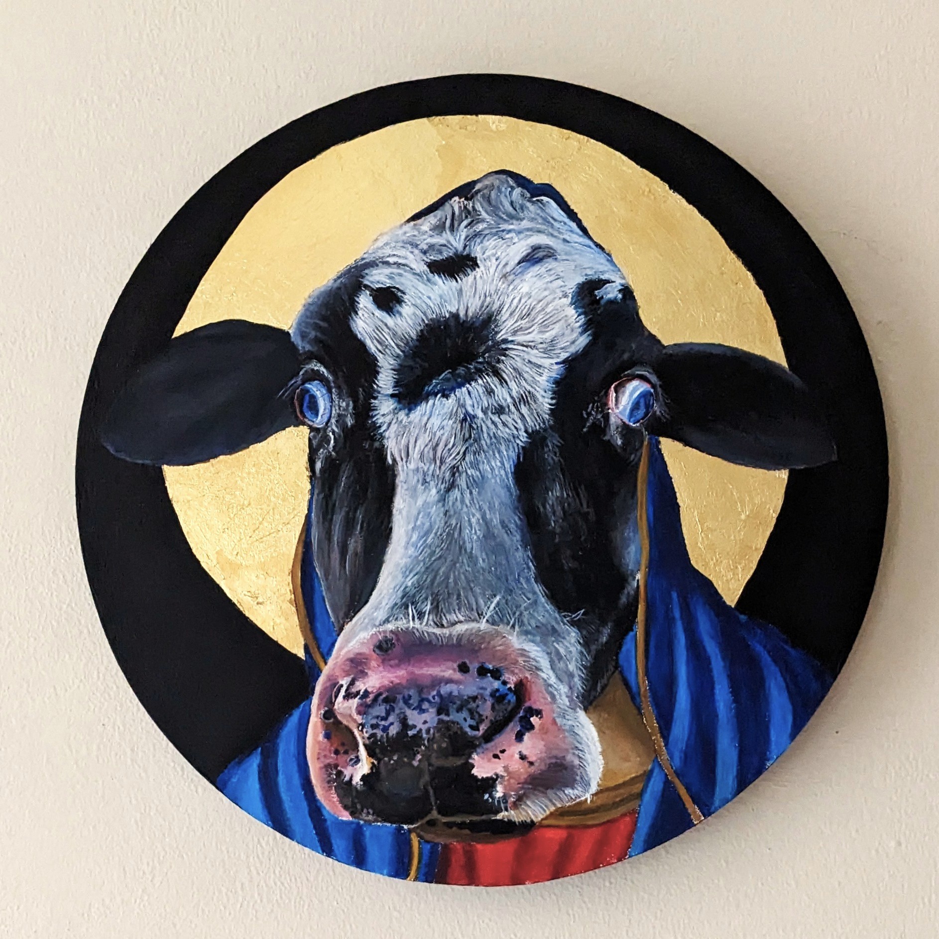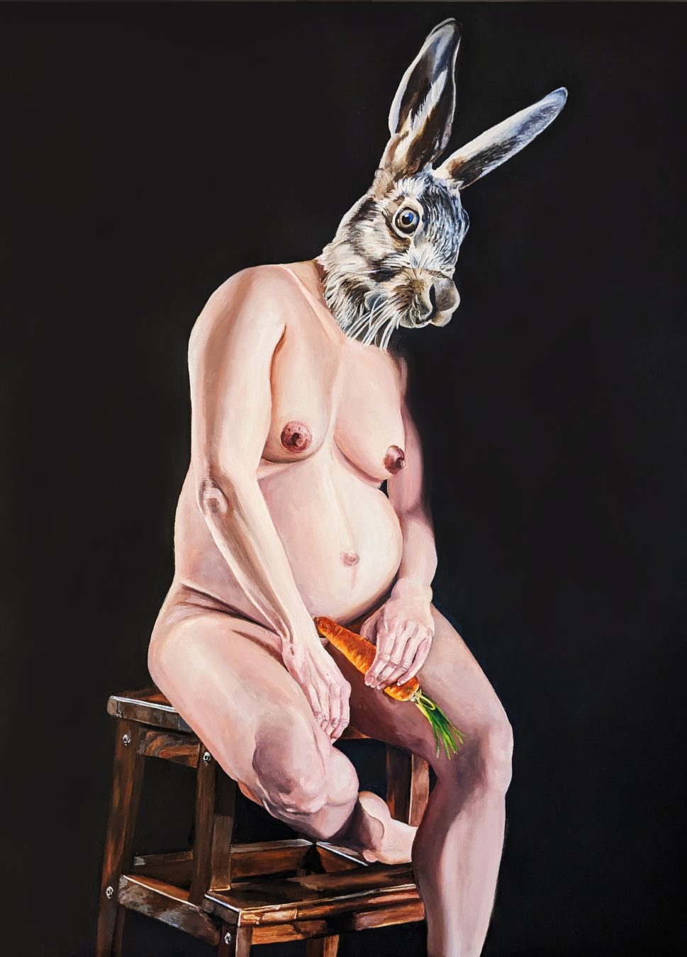 Trophy Wife, acrylic on panel with found antlers, 20×12,” 2025Holy Cow II, acrylic and gold leaf on panel, 12×12,” 2025Vagina Dentata, acrylic on canvas, 8×10,” 2025Bull Dagger, acrylic on canvas, 48×36,” 2025Like Rabbits, acrylic on canvas, 40×30,” 2025Carnivores, acrylic on canvas, 24×36,” 2024Venus Vulgaris, acrylic on canvas, 60×48,” 2024Holy Cow, acrylic and gold leaf on canvas, 48×36,” 2024Breeder, acrylic on canvas, 36×48,” 2024Who’s on Your Plate? I, acrylic on ceramic, 8×8,” 2024Who’s on Your Plate? II, acrylic on ceramic, 8×8,” 2024Who’s on Your Plate? III, acrylic on ceramic, 8×8,” 2024Hogtied, acrylic on canvas, 40×30,” 2023Good Lay, acrylic on canvas, 40×30,” 2023Pulling Wool, acrylic on canvas, 30×40,” 2023Milk Maid, acrylic on canvas, 24×30″, 2023Miss Piggy, acrylic on canvas, 40×30″, 2023Forbidden Fruit, acrylic on canvas, 12×12″, 2023Something Fishy, acrylic on canvas, 12×12″, 2023Rose Bush, acrylic on canvas, 12×12″, 2023Hysteria, acrylic on canvas, 16×20″, 2023